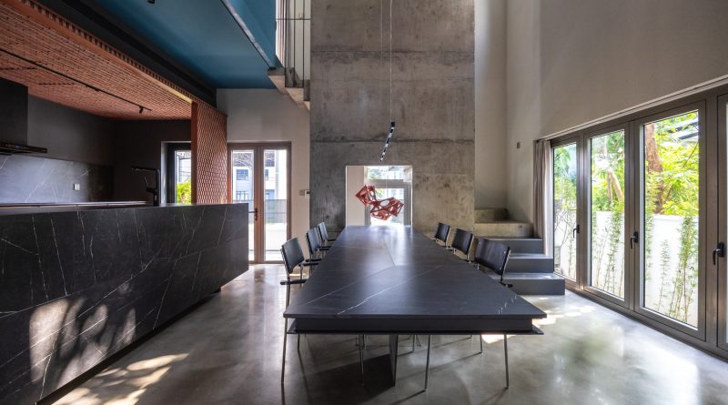 Sự tương tác giữa các bề mặt vật liệu tự nhiên – gạch nung, thép, gỗ và bê tông trần – và sự điều chỉnh ánh sáng biến đổi không gian nội thất thành một không gian cân bằng, nơi sự tiếp xúc vật liệu và sự tĩnh lặng bên trong cùng tồn tại.