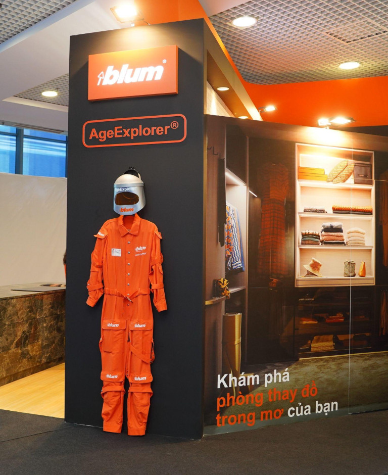 Tại gian hàng của Blum, khách tham quan cũng có thể trực tiếp trải nghiệm bộ trang phục mô phỏng tuổi tác AgeExplorer – tái hiện tình trạng sức khỏe của một người lớn tuổi, trên cơ sở thông tin Blum thu thập qua quá trình nghiên cứu kéo dài nhiều năm. Điều này góp phần giúp Blum phát triển những tính năng tiện lợi, ưu việt của phụ kiện nội thất, từ đó hỗ trợ cải thiện các quy trình khi sử dụng bếp và trong mọi sinh hoạt hằng ngày, giúp chúng khoa học và đơn giản hơn.