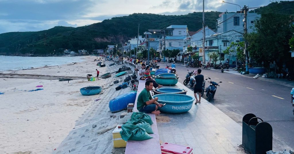 Người dân hối hả đưa thuyền thúng lên bờ trước khi bão Kalmaegi ập đến