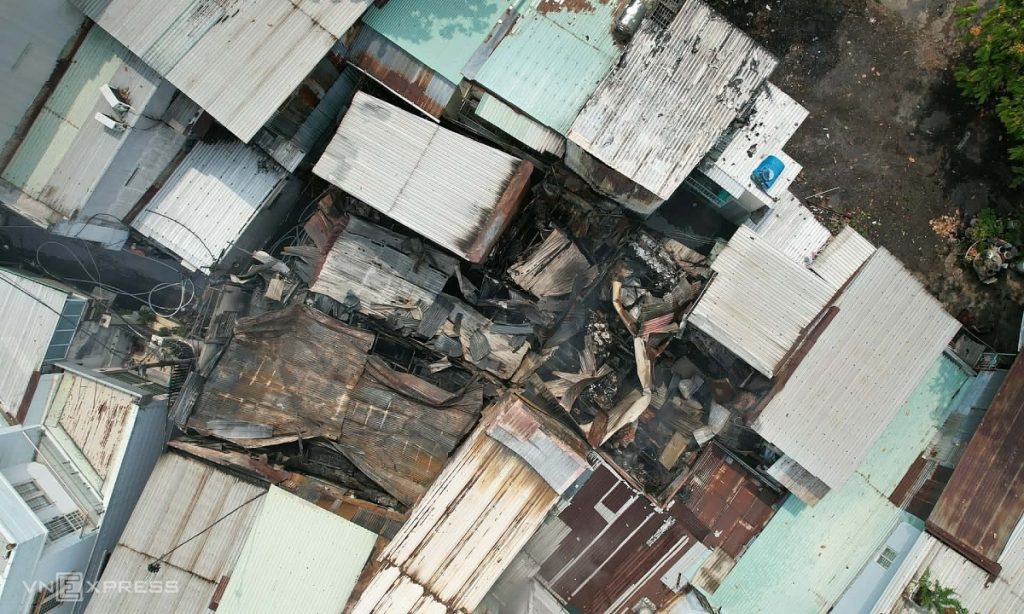 Hiện trường 4 căn nhà bị cháy nhìn từ trên cao. Ảnh: Đình Văn