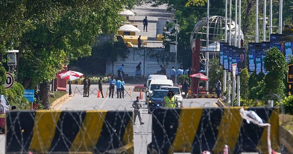 Cảnh sát đứng canh gác trên một con đường bị phong tỏa ở thủ đô Islamabad – Pakistan hôm 10-4, một ngày trước khi Mỹ và Iran dự kiến tiến hành đàm phán tại đó. Ảnh: AP