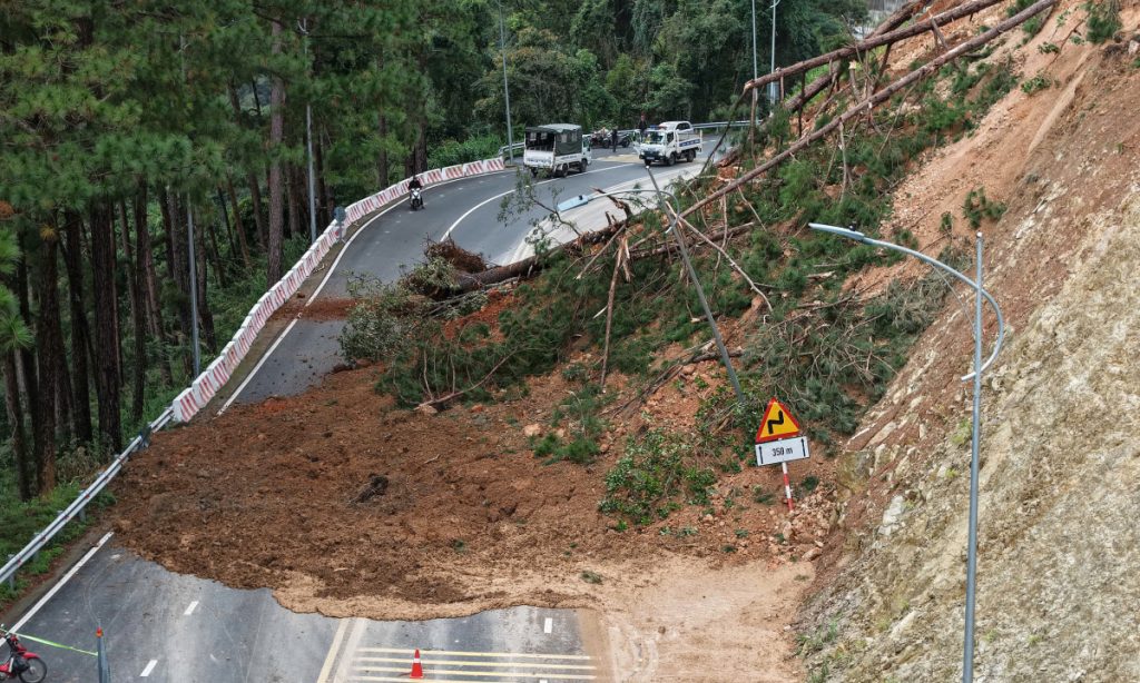Hàng tấn đất đá, cây cối chắn ngang đèo Prenn (phường Xuân Hương, Đà Lạt) khiến giao thông gián đoạn. Khu vực này cách điểm sạt lở hôm 17/11 khoảng 300 m.
