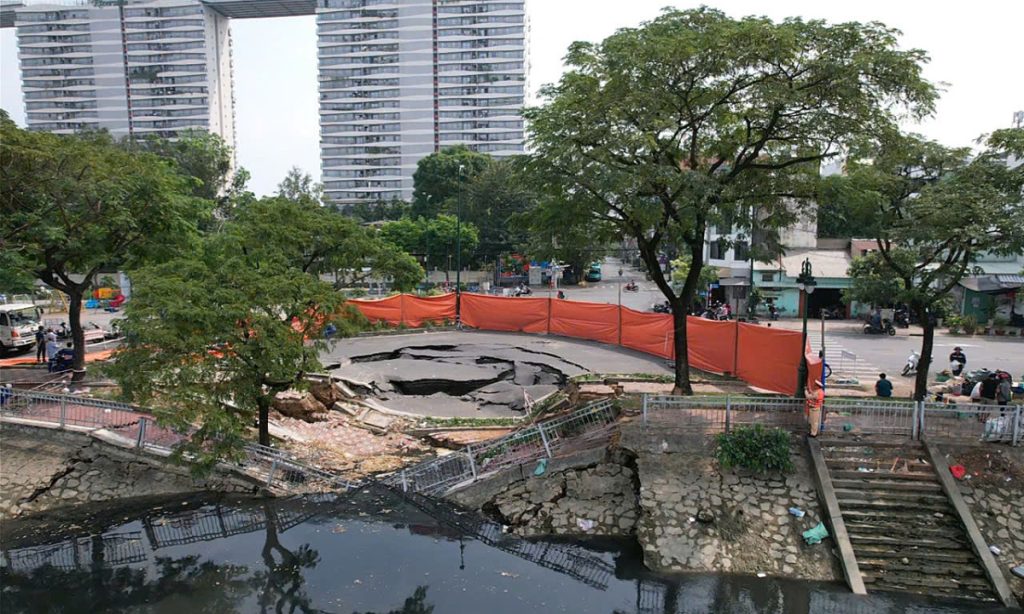 Ông Đức Minh, sống gần hiện trường, cho biết nhiều ngày trước đã thấy nước rò rỉ qua các khe hở trên vỉa hè, gần lan can dọc kênh và bờ kè bêtông phía dưới. Từ sáng sớm, mặt đường bắt đầu xuất hiện các vết nứt rồi lan rộng. Người dân trong khu vực đã chủ động cảnh báo người đi xe máy tránh qua đoạn này.