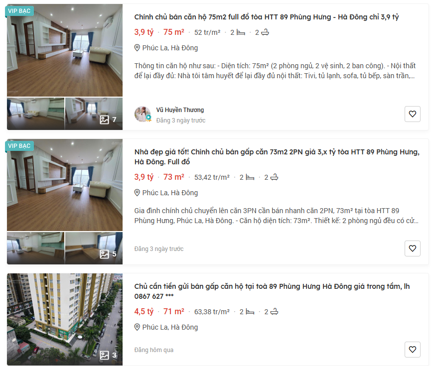 Giá rao bán căn hộ ở 89 Phùng Hưng dao động trong khoảng từ 50-63 triệu đồng/m2.