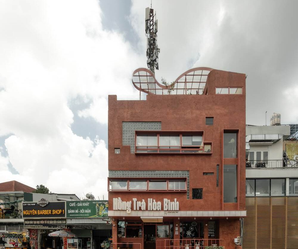 Lựa chọn vật liệu cũng là chìa khóa cho phương pháp tiếp cận kiến trúc. Lấy cảm hứng từ đất bazan đỏ đặc trưng của Tây Nguyên, nơi dự án tọa lạc, lớp hoàn thiện chính sử dụng kết cấu và màu sắc cộng hưởng với cảnh quan khu vực. Bảng màu vật liệu này không chỉ giúp tòa nhà hòa nhập với bối cảnh địa phương mà còn phù hợp với câu chuyện thương hiệu của Hồng Trà Hòa Bình, nơi tìm cách tôn vinh bản sắc văn hóa và môi trường của vùng cao nguyên.