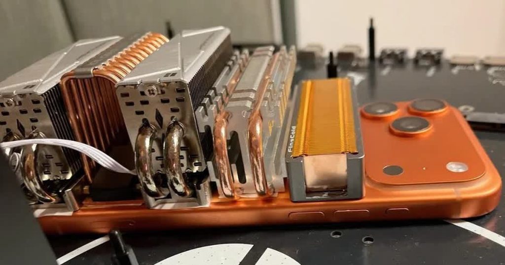 Theo TechSpot, chỉ một tháng sau khi lên kệ, chiếc iPhone 17 Pro Max mới nhất đã trở thành ‘nạn nhân’ của một thử nghiệm điên rồ nhưng đầy hiệu quả. Một modder đã gắn hàng loạt tản nhiệt dành cho ổ cứng SSD lên lưng máy, biến nó thành một ‘con quái vật’ và đạt được những con số hiệu năng benchmark chưa từng có, hé lộ tiềm năng thực sự bị kìm hãm bởi nhiệt độ.