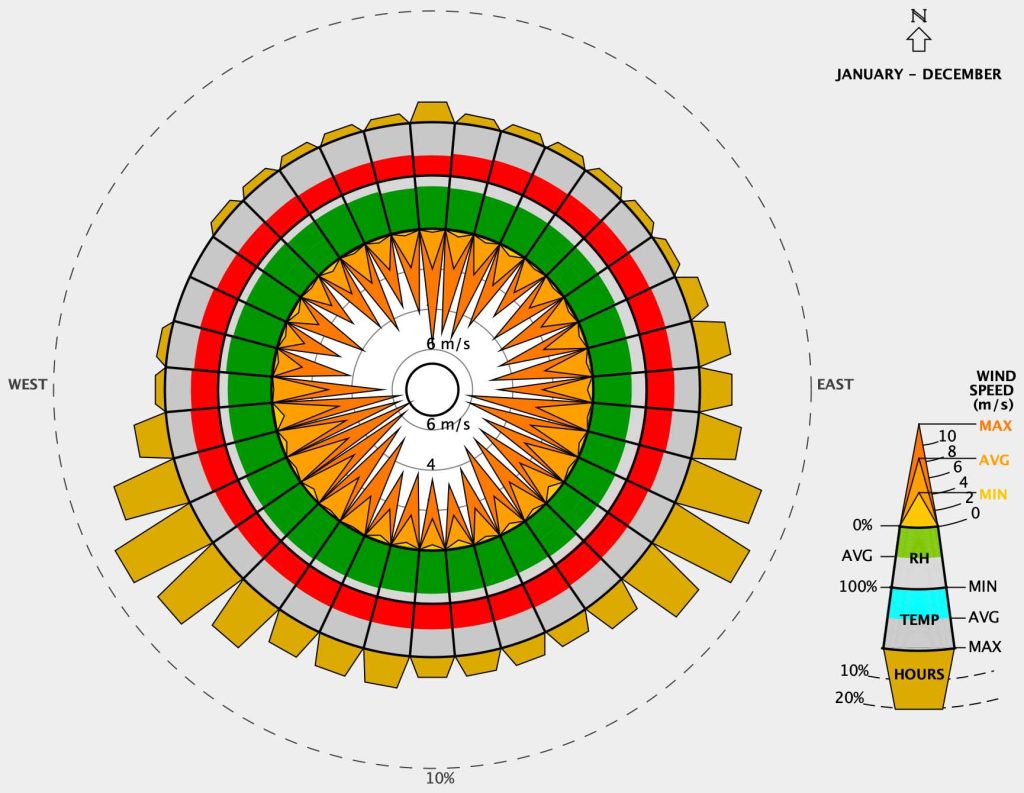 Biểu đồ nhiệt độ (a) và hoa gió (b) của Vĩnh Long (trích xuất từ Climate Consultant)