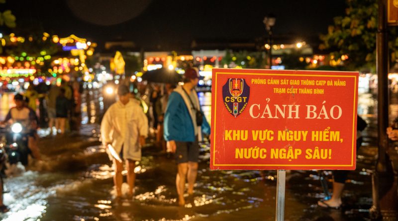 Càng về khuya, nước sông Hoài càng dâng cao, tràn vào phố cổ Hội An, chỗ sâu nhất khoảng một mét, du khách lội nước ngắm phố trong đêm mưa lũ.