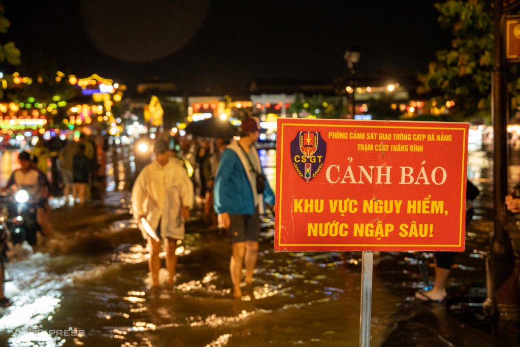 Càng về khuya, nước sông Hoài càng dâng cao, tràn vào phố cổ Hội An, chỗ sâu nhất khoảng một mét, du khách lội nước ngắm phố trong đêm mưa lũ.