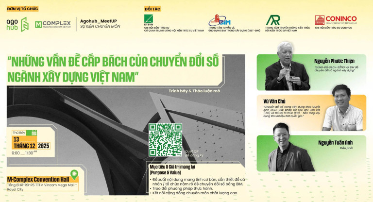 Với mong muốn đưa đến những nội dung cần thiết để cá nhân/tổ chức nắm rõ để chuyển đổi số bằng BIM, trao đổi phương pháp thực hành cũng như kết nối cộng đồng chuyên môn chất lượng cao, cộng đồng Kiến trúc Xây dựng Agohub sẽ phối hợp cùng Chi hội kiến trúc sư cơ quan trung ương Hội Kiến trúc sư Việt Nam và các đơn vị để tổ chức sự kiện meetup chuyên môn với chủ đề “Những vấn đề cấp bách của chuyển đổi số ngành xây dựng Việt Nam” ngày 13/12/2025 tại Hà Nội. Trân trọng kính mời quý bạn đọc quan tâm tham dự.