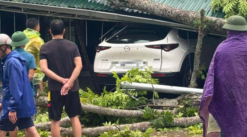 Một ô tô của người dân xã Minh Sơn bị cây và mái nhà đổ đè trúng gây hư hỏng