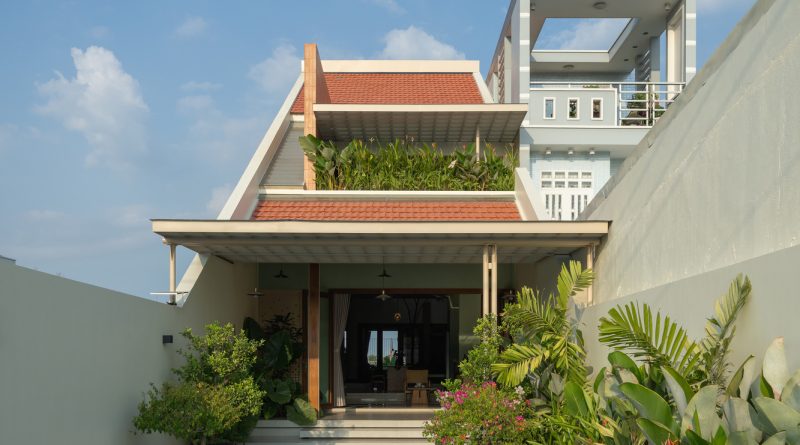 Tòa nhà chính nằm sâu trong khuôn viên, để lại một khoảng sân rộng rãi, đóng vai trò như một “vùng đệm xanh” chuyển tiếp. Khu vườn mở này giúp giảm tiếng ồn, lọc bụi và tạo ra một khoảng không gian yên tĩnh trước khi bước vào nhà. Ngôn ngữ kiến trúc được lấy cảm hứng từ truyền thống địa phương: mái ngói đỏ dốc và hiên trước và sau rộng rãi mang lại cả bản sắc thị giác lẫn sự thoải mái về vi khí hậu.