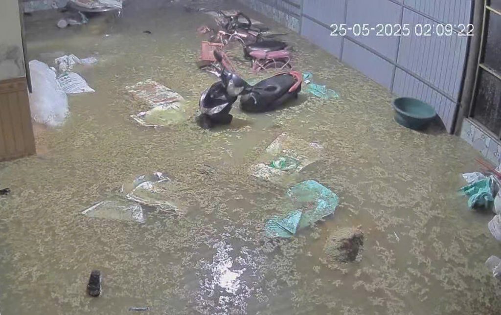 Nhà dân ở xã Cẩm Duệ nước tràn vào sân gây ngập nửa mét, lúc 2h ngày 25/5. Ảnh: Hùng Lê