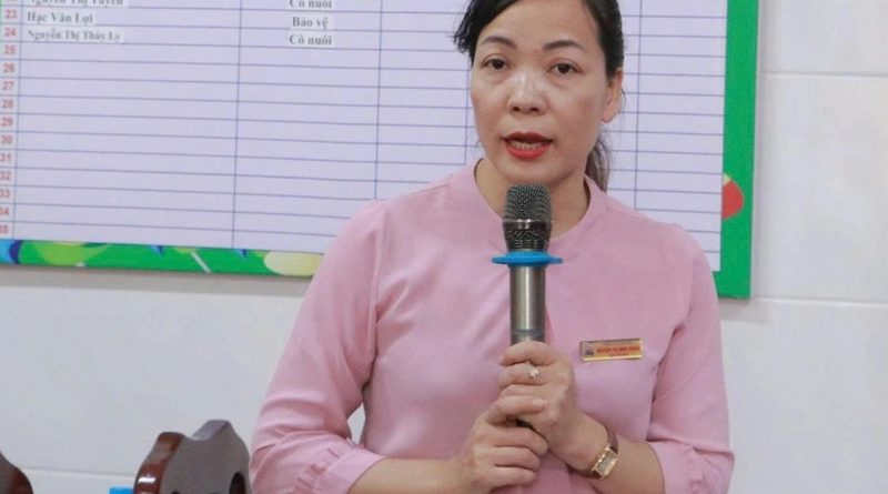 Bà Nguyễn Thị Minh Khoái bị tạm đình chỉ công tác để cơ quan chức năng làm rõ vụ việc phát hiện thịt lợn bệnh trong bếp ăn bán trú Trường mầm non Hòa Bình
