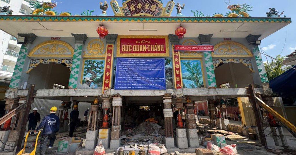Theo giấy phép xây dựng, công trình có diện tích 443,5 m2, chiều cao công trình 9,5m được di dời lên cao 1,5m. Chiều 2.8, công trình đã hoàn tất việc nâng cao theo đúng yêu cầu. Ông Nguyễn Văn Cư chia sẻ: “Ngôi đền trải qua nhiều lần xây dựng trùng tu nên các cụm đà cột không đồng bộ. Để đẩy nhanh quá trình nâng nền, tôi đã chọn giải pháp bó các cột gần nhau thành một khối và nâng cao luôn một lần thay vì phải nâng nhiều lần riêng biệt. Cho đến ngày hôm nay thì công trình đã hoàn tất hạng mục quan trọng nhất là nâng lên cao 1,5m đúng theo yêu cầu, đáng nói là thời gian thực hiện chỉ 1 tháng 3 ngày, vượt tiến độ 20 ngày. Phần còn lại là gia cố nền móng, xây tường bao, lấp nền…
