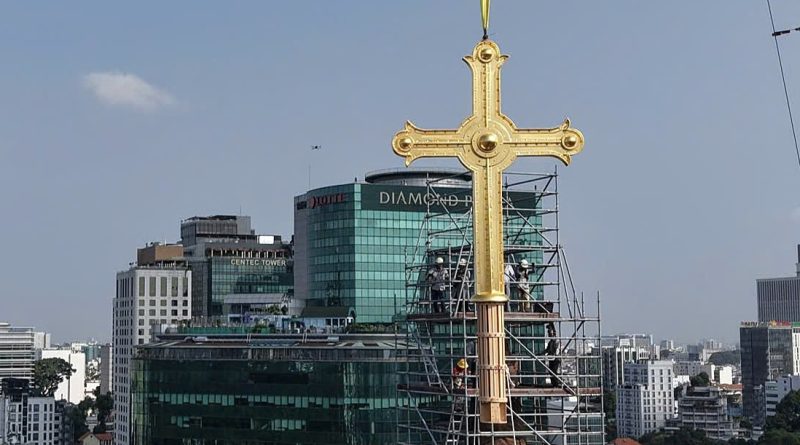 Sáng qua, hai thánh giá mạ vàng nặng 400 kg được đưa lên đỉnh tháp kẽm cao 57 m của Nhà thờ Đức Bà Sài Gòn thay thế hai chiếc cũ đã xuống cấp.