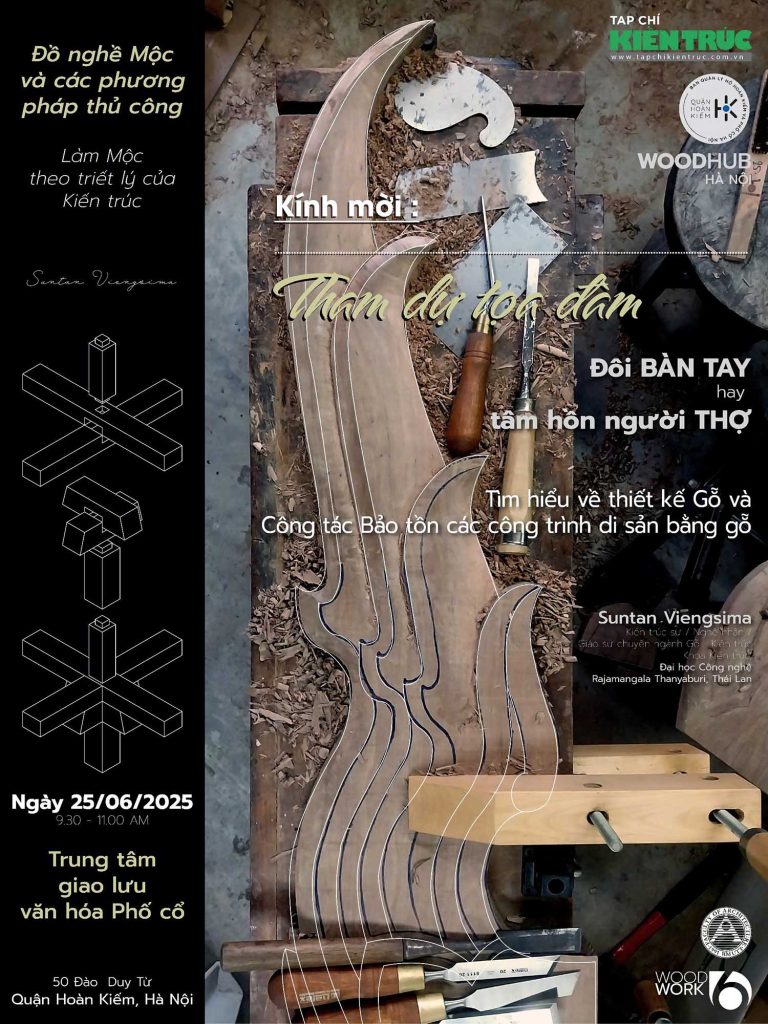 Với sự hợp tác giữa Wood hub Hà Nội, Ban Quản lý Hồ Hoàn Kiếm và Phố cổ Hà Nội, Sở Văn hóa và Thể Thao Hà Nội, Tạp chí Kiến trúc – Hội KTS Việt Nam phối hợp tổ chức Tọa đàm với sự tham gia của diễn giả chính – KTS Suntan Viengsima (Thailand) sẽ chia sẻ những triết lý và tình yêu của ông với gỗ trong hành trình làm nghề, đào tạo KTS và bảo tồn di sản.