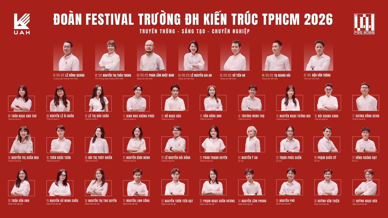 Tham gia Liên hoan Sinh viên Kiến trúc Toàn quốc 2026, đoàn sinh viên Trường Đại học Kiến trúc TP.HCM (UAH) xem đây là cơ hội quý giá để kết nối, học hỏi, chia sẻ và giao lưu cùng cộng đồng giảng viên, sinh viên kiến trúc trên khắp cả nước. Đoàn đến với Liên hoan không chỉ để thi đấu, mà để đặt mình vào một không gian học thuật rộng lớn hơn – nơi mỗi cuộc trao đổi, mỗi câu chuyện chuyên môn đều trở thành hành trang cho hành trình nghề nghiệp tương lai. Trong không khí đặc biệt kỷ niệm 50 năm thành lập Trường và 100 năm tiếp nối hành trình đào tạo kiến trúc sư tại Việt Nam, đoàn UAH càng thêm vinh dự khi đồng hành cùng 27 đơn vị đào tạo trên toàn quốc.