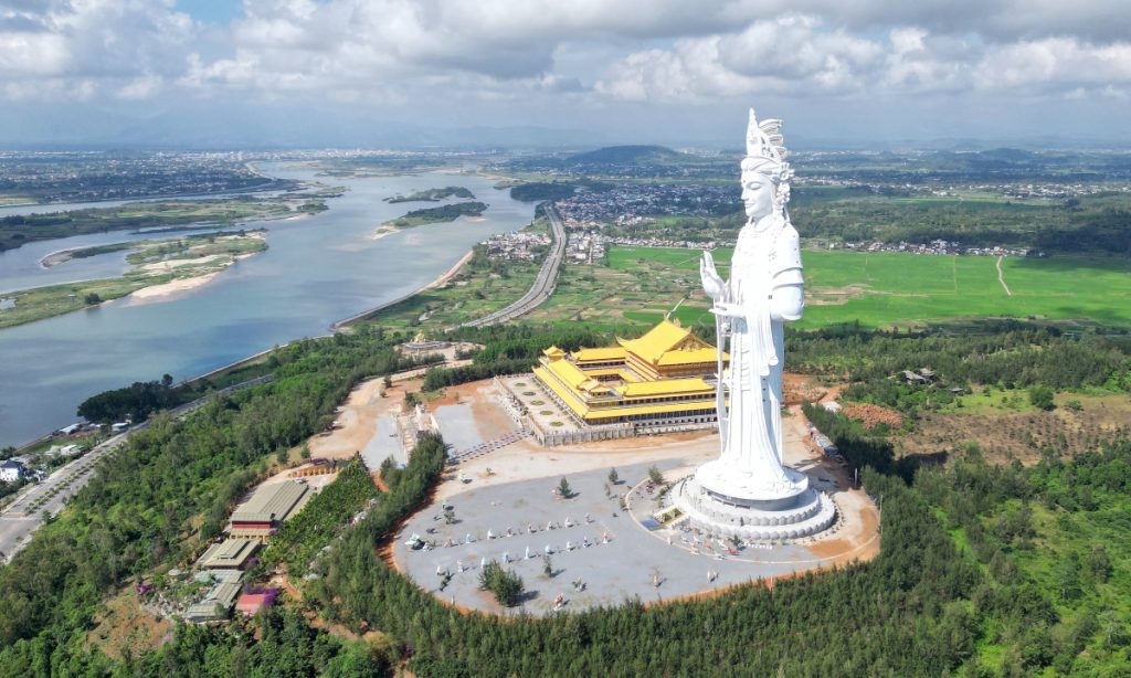 Từ chánh điện chùa Minh Đức nhìn sang tượng Phật Quan âm ở phía đông.